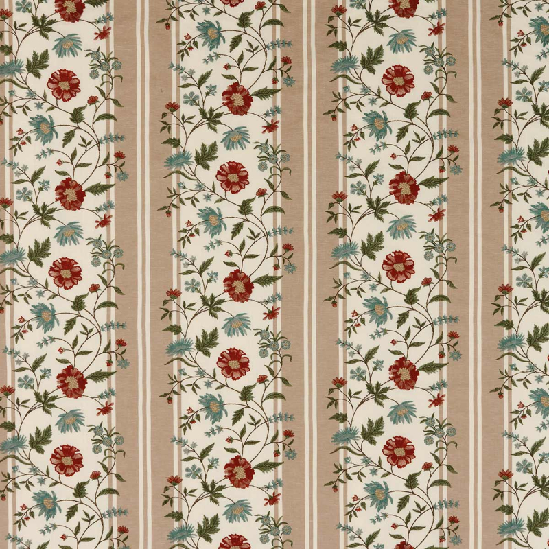 Colmar es un tejido con estampado floral a rayas de Nina Campbell. El diseño se compone de tallos flexibles cargados de corolas florecidas y pequeñas hojas dentadas. Cada franja vertical enmarca los ramilletes trepadores separados por intervalos lisos que estructuran el conjunto. Las curvas vegetales aportan una sensación de movimiento continuo, en un estilo decorativo clásico con acentos campestres.