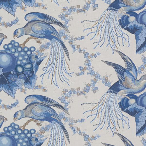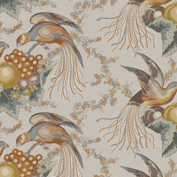 Belvedere revela un suntuoso motivo figurativo. Pájaros de plumaje elaborado rodean una cornucopia de generosos racimos, frutos redondos y follaje opulento. Las ligeras guirnaldas florales salpican el fondo y añaden un delicado contraste a la densidad central. Este papel pintado de Zimmer + Rohde evoca una escena exuberante y meticulosamente orquestada.