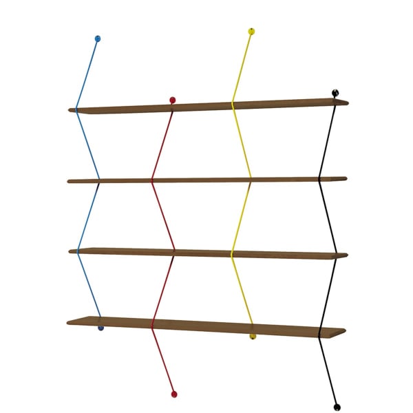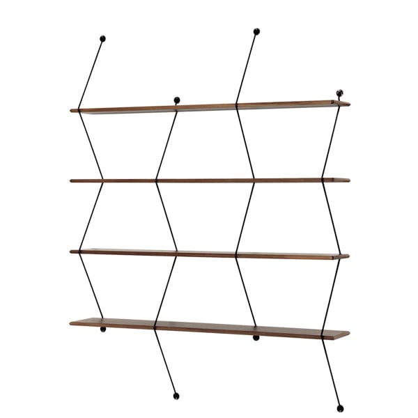 LCE signe l’étagère Climb noyer, un mobilier mural dont la présence graphique structure le regard. Des planches en bois biseautées dessinent des lignes horizontales franches, suspendues par des câbles rigides en acier qui tracent un motif géométrique aérien. L’ensemble compose une trame en zigzag, presque architecturale. Le noyer révèle sa matière et installe une profondeur calme.