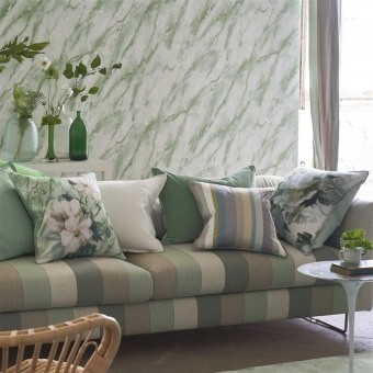 Poggiano su sfondi marmorizzati o strutturati per illustrare in dettaglio i giardini all'italiana. Notiamo in particolare la presenza di peonie e rose. La geometria e le strisce patchwork completano questa gamma nella diversità. Questi motivi sono stampati digitalmente su supporti in lino o cotone. Questi materiali nobili e naturali portano la loro bellezza, la loro praticità e la loro resistenza ai tessuti. Abbinati alla tecnica di stampa, mettono in risalto i colori utilizzati. Questi trasmettono fascino e morbidezza, oltre a chiarezza con toni chiari e pastello.