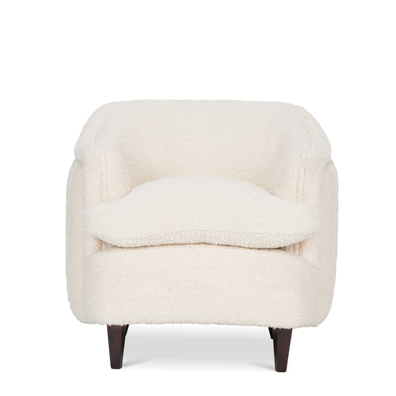 La poltrona Scarlett Schaffell seduce con la sua silhouette scolpita e il suo rivestimento in lana bouclé. Voluminosa, presenta uno schienale curvo, braccioli profondi e una seduta generosa. Il motivo a tinta unita strutturato esalta il tatto e diffonde un caldo linguaggio visivo. Sottolineato da borchie invecchiate, questo modello firmato Mindthegap afferma il suo carattere, sostenuto da gambe in legno scuro.
