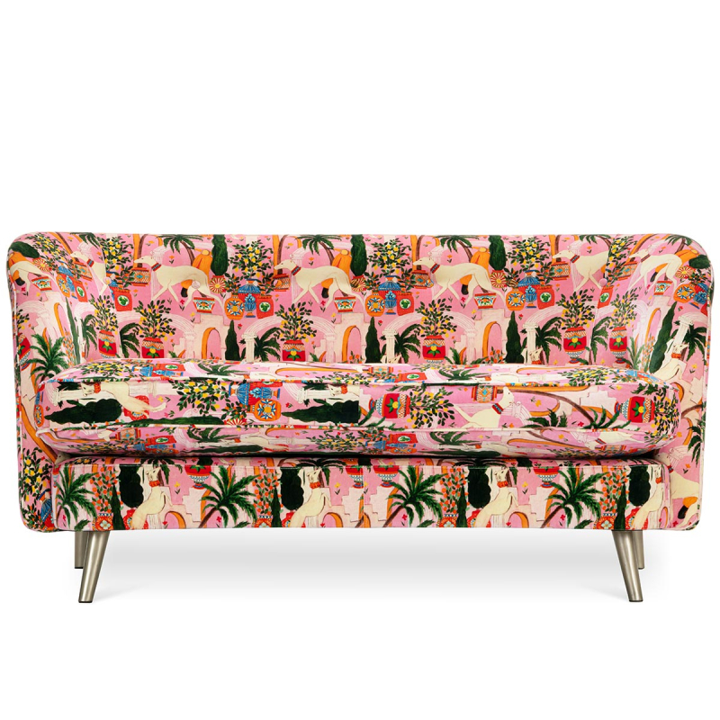 Il divano Venice Dolce Vita è rivestito in velluto di cotone setoso al tatto, raffinato riflesso di un palazzo italiano. Il suo motivo narrativo, ispirato ai paesaggi mediterranei, forma un arredamento poetico. Le figure femminili si intrecciano con elementi architettonici e vegetali in una composizione densa. Lo schienale imbottito, posato su gambe in metallo, rafforza il design avvolgente firmato Mindthegap.