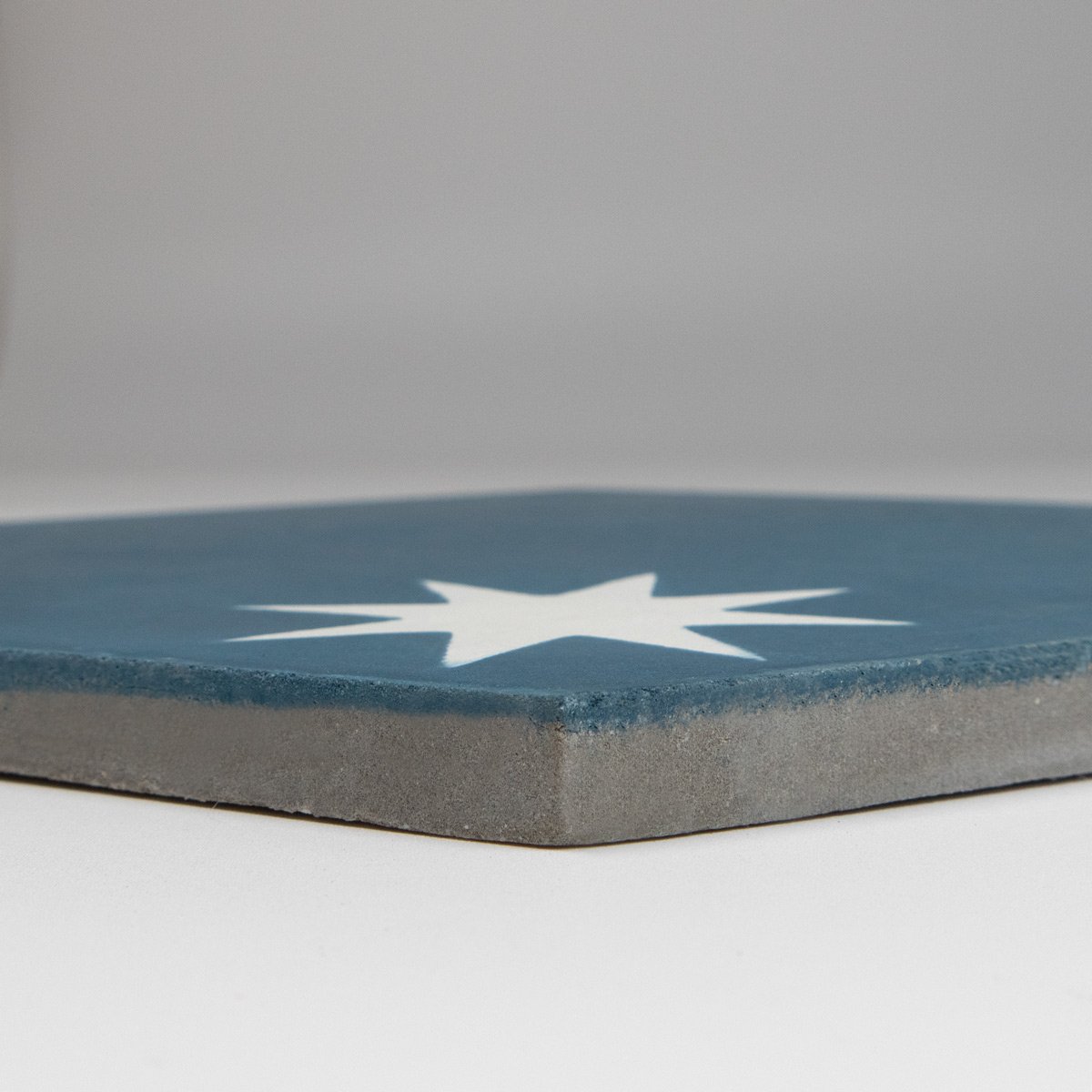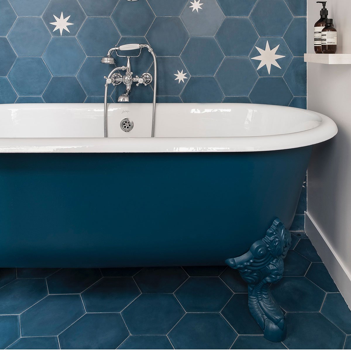 Il rivestimento Hex Star è composto da quattro tessere che si incastrano a piacere per creare una notte stellata. Le tessere possono essere mescolate in proporzioni variabili per ripetere più o meno spesso le tre dimensioni del disegno. Questo design, immaginato da Popham, apporta molta morbidezza agli interni.