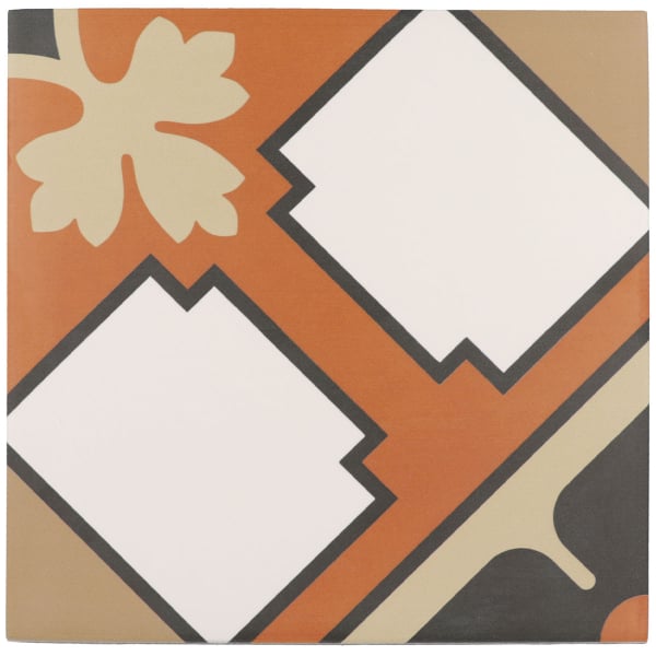 La piastrella in gres porcellanato Turin firmata Equipe si distingue per un motivo floreale e geometrico audace. Figure rettangolari irregolari, delimitate da contorni netti, sono disposte in diagonale. Un frammento di croce arrotondata incorniciata occupa un angolo e crea una struttura grafica. Un angolo accoglie una foglia astratta che aggiunge una nota organica al rigore delle linee.