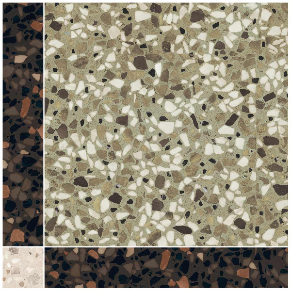 Un motivo minerale ispirato al terrazzo si estende sulla Mosaica Chicco Regolo realizzata da 41zero42. Composta da formati quadrati e rettangolari, la piastrella presenta una superficie dinamica e ritmata. Le schegge di pietra si intrecciano con delicatezza e disegnano una trama vivace. Il materiale rivela un rilievo sottile e una presenza grafica sfumata.