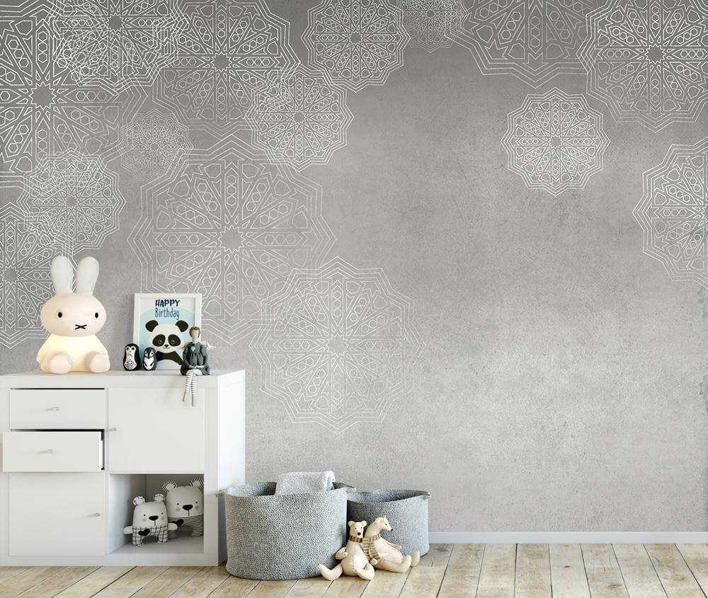 Carta da parati Tres Tintas, Alandalus presenta un motivo ispirato ai mosaici andalusi, tutto in sfumature e grovigli. Gli ornamenti geometrici evanescenti si sovrappongono e donano profondità all'insieme.