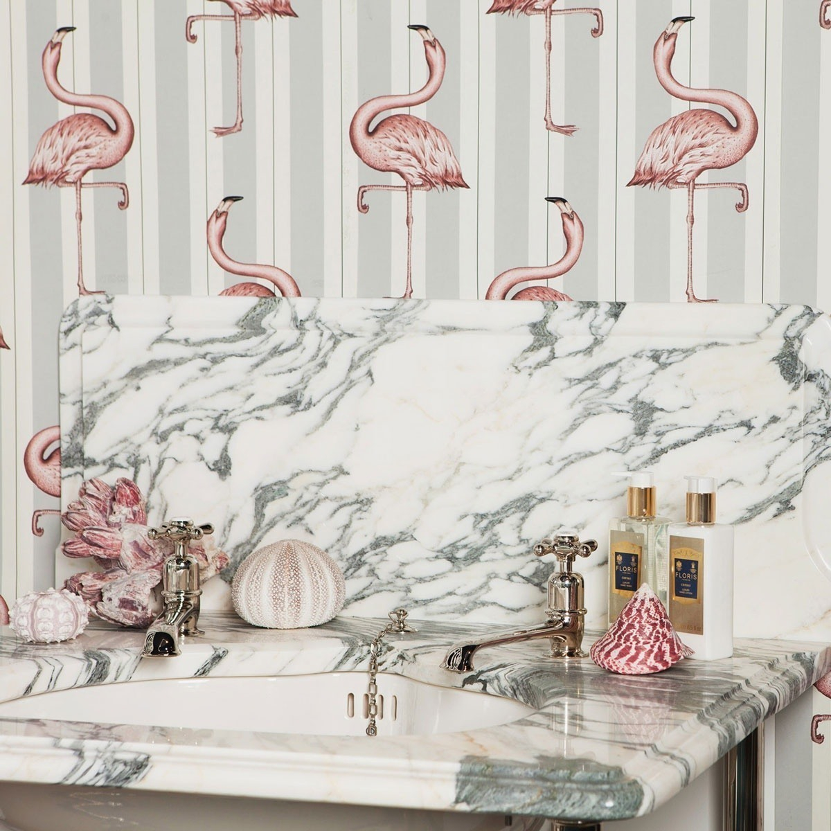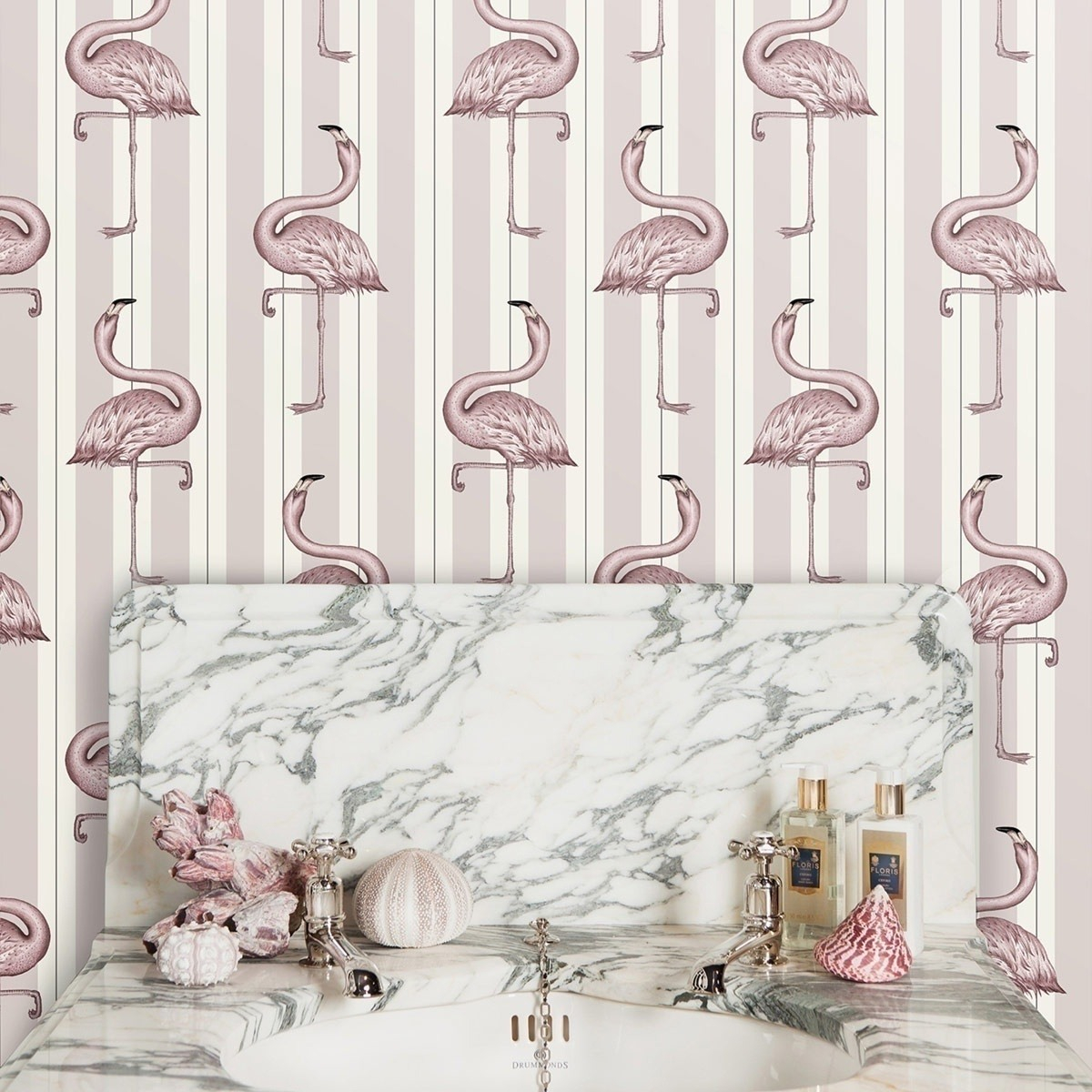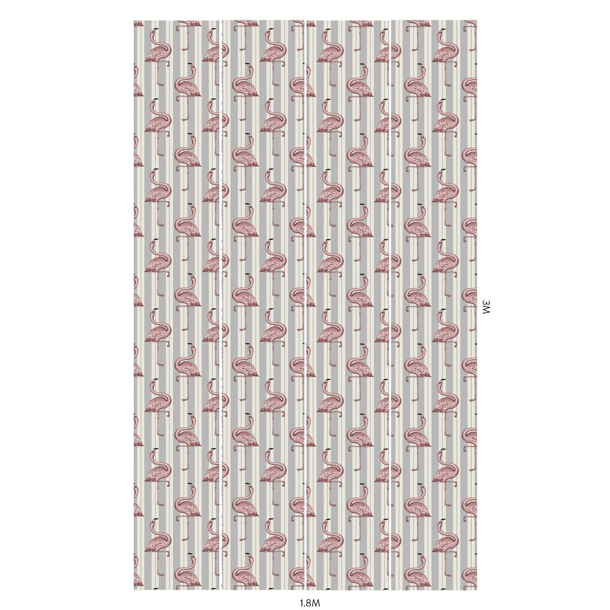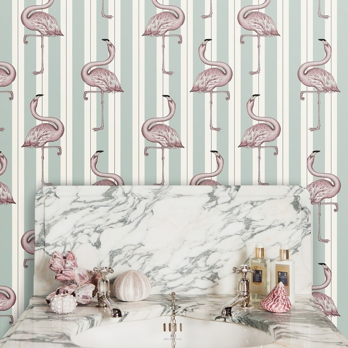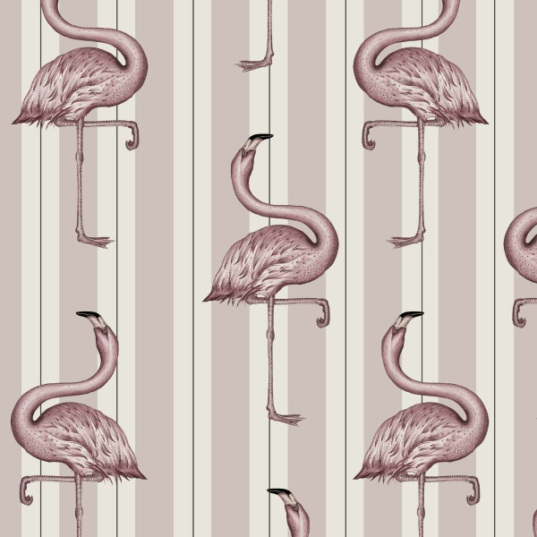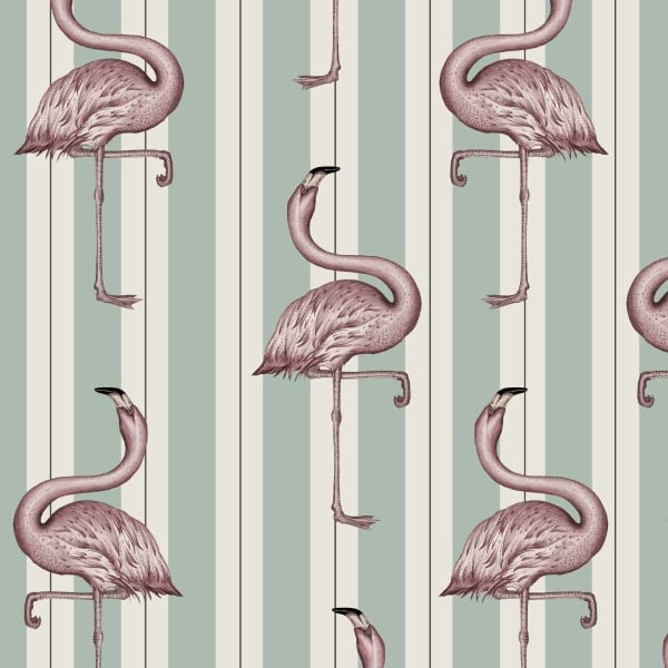 Eleganti fenicotteri rosa si pavoneggiano su questa giocosa carta da parati dai colori pastello e uno sfondo a strisce. Lo sfarzo di House of Hackney ravviva le pareti e crea un'atmosfera esotica e raffinata. Questa carta da parati è non tessuta, è facile da installare.