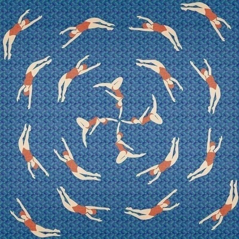 Let's Dance Swimmers di Coodonné è un elegante pannello di carta da parati. Presenta sagome di nuotatori che ballano sul fondo di una piscina, creando un cerchio elegante. È progettato in uno spirito pop.