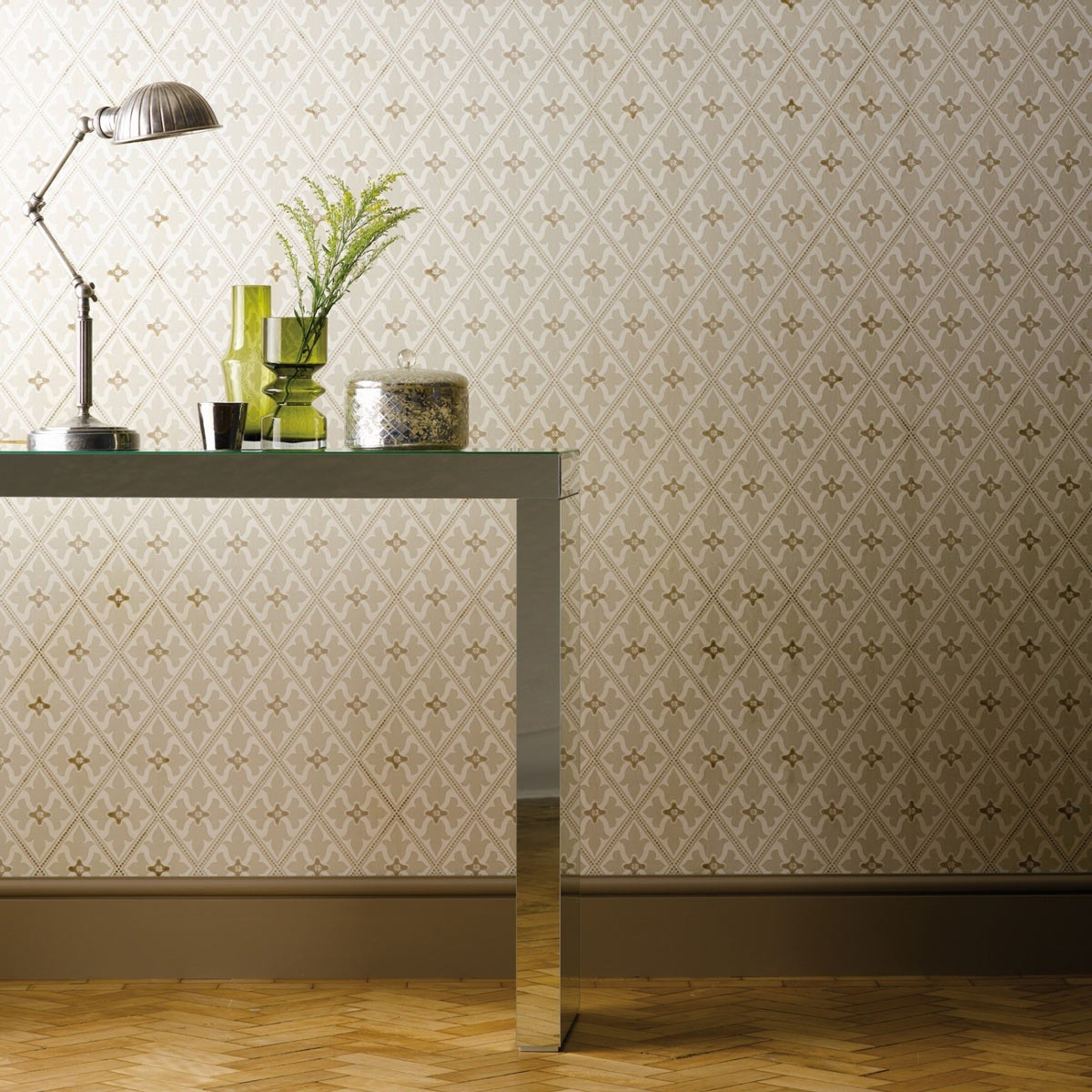 Bayham Abbey è un'elegante carta da parati in stile gotico inglese. Questa creazione Little Greene con il suo delicato motivo giglio in un diamante ricorda le decorazioni reali del XVII secolo. È disponibile in toni tenui e naturali, i colori Spanish Gold e Celestiel hanno riflessi dorati.