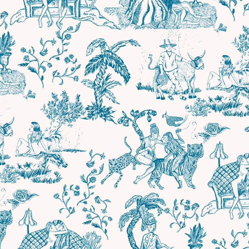 La carta da parati Tipsy Love con motivo toile de Jouy country presenta scene d'amore su uno sfondo chiaro. Un disegno rilassante le cui quattro storie lasciano spazio all'immaginazione.