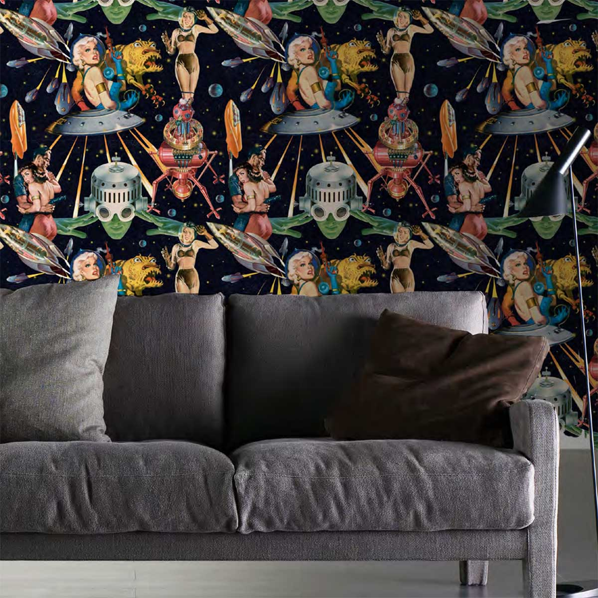 Con Other Worlds, Mindthegap rivisita dischi volanti, alieni ed eroi immaginari. Su uno sfondo spaziale, i colori si armonizzano per dare vita a una grande avventura. Questa carta da parati in tessuto non tessuto è sinonimo di fuga e si adatta facilmente al soggiorno o alla camera da letto. Questo rivestimento murale opaco ha una sensazione leggermente vellutata.