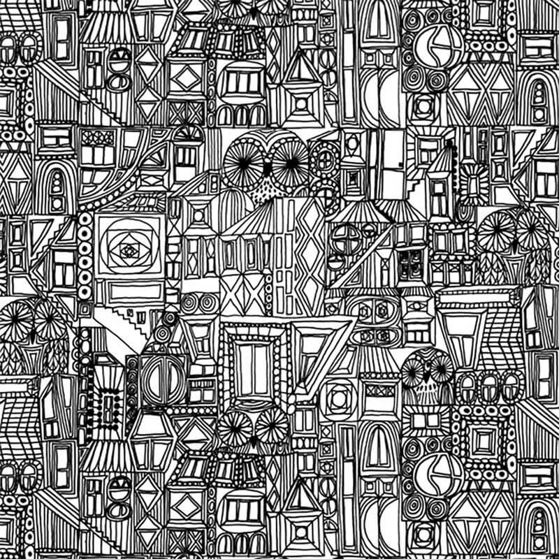 La carta da parati Bubi dal motivo stravagante è stata disegnata da Maija Louekari per Marimekko. Mostra una fusione di forme geometriche con l'aspetto di una composizione moderna astratta. Ci sono, tra le altre cose, finestre, tetti di tegole e teste di gufi. I suoi colori sobri esaltano il lato artistico del modello.