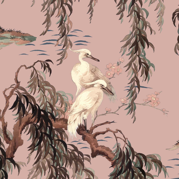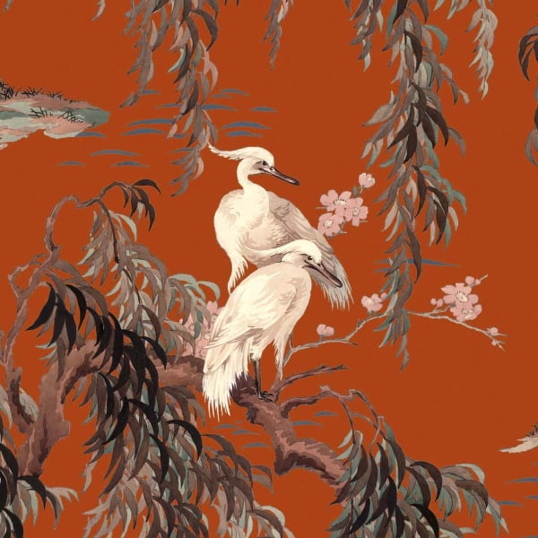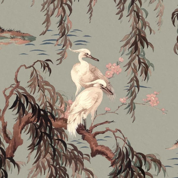 Zeus è una carta da parati che si ispira chiaramente ai disegni tradizionali cinesi. Raffigura due gru su un ramo di salice piangente anch'esso fiorito. L'intero dipinto è posizionato vicino a un lago, conferendo a questa stampa digitale un'atmosfera serena. Priva di PVC, questa carta da parati di House of Hackney è ecologicamente certificata.