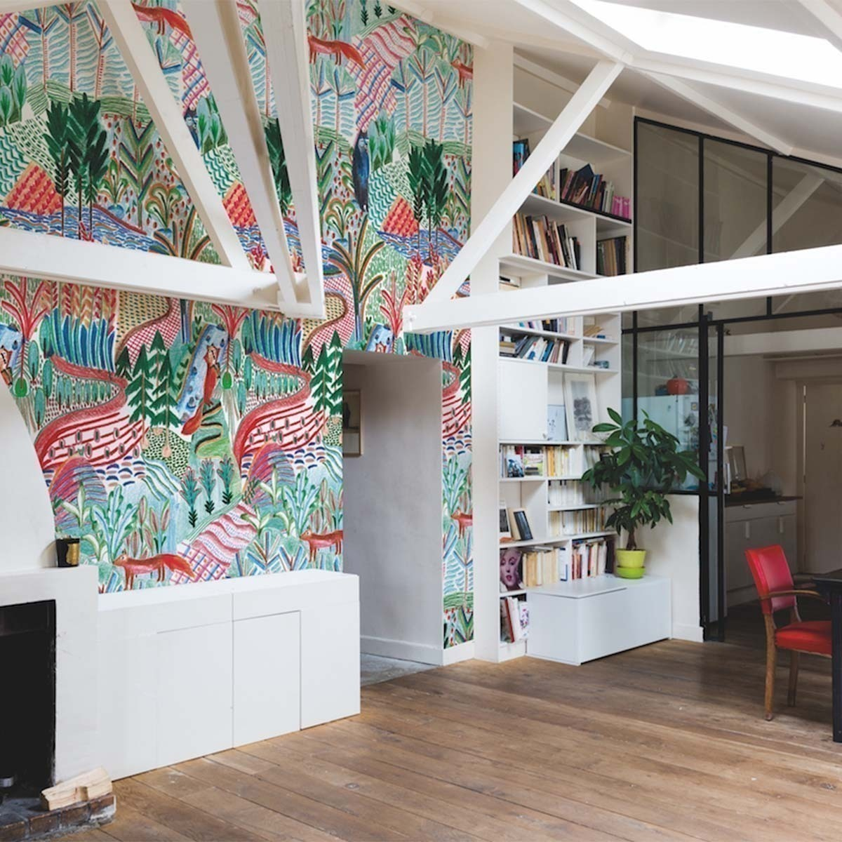 Chicoutimi ricorda il lavoro di David Hockney, una figura di spicco del movimento pop art degli anni '60, infatti, i colori vivaci e gioiosi, abbinati alle linee rotonde del disegno, ma anche il lato grafico ricordano questo stile. Il motivo di questo pannello di Bien Fait mostra un paesaggio caldo che sembra uscito da un sogno, con una volpe e un lupo sproporzionatamente sulle zampe posteriori.