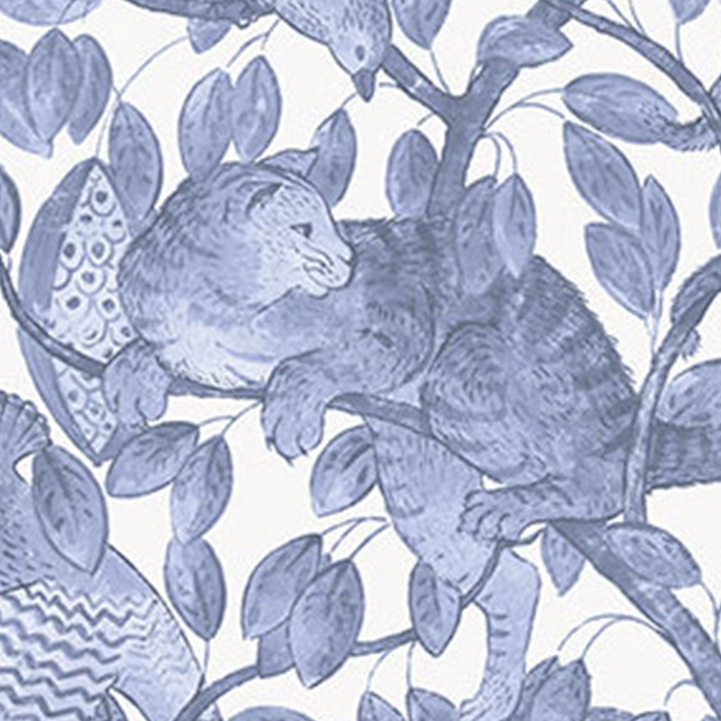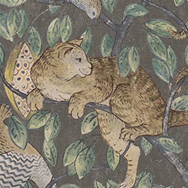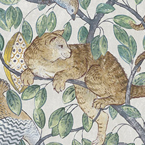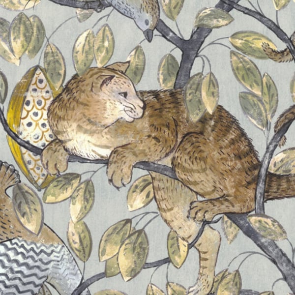Zippy's Hide and Seek presenta gatti e uccelli appollaiati su un albero, che giocano a nascondino. Innocente e giocosa, la scena crea un tocco di allegria e la scelta dei colori e delle sfumature è sobria e varia. La carta da parati è una creazione che proietta un'atmosfera vivace e divertente nella tua casa.