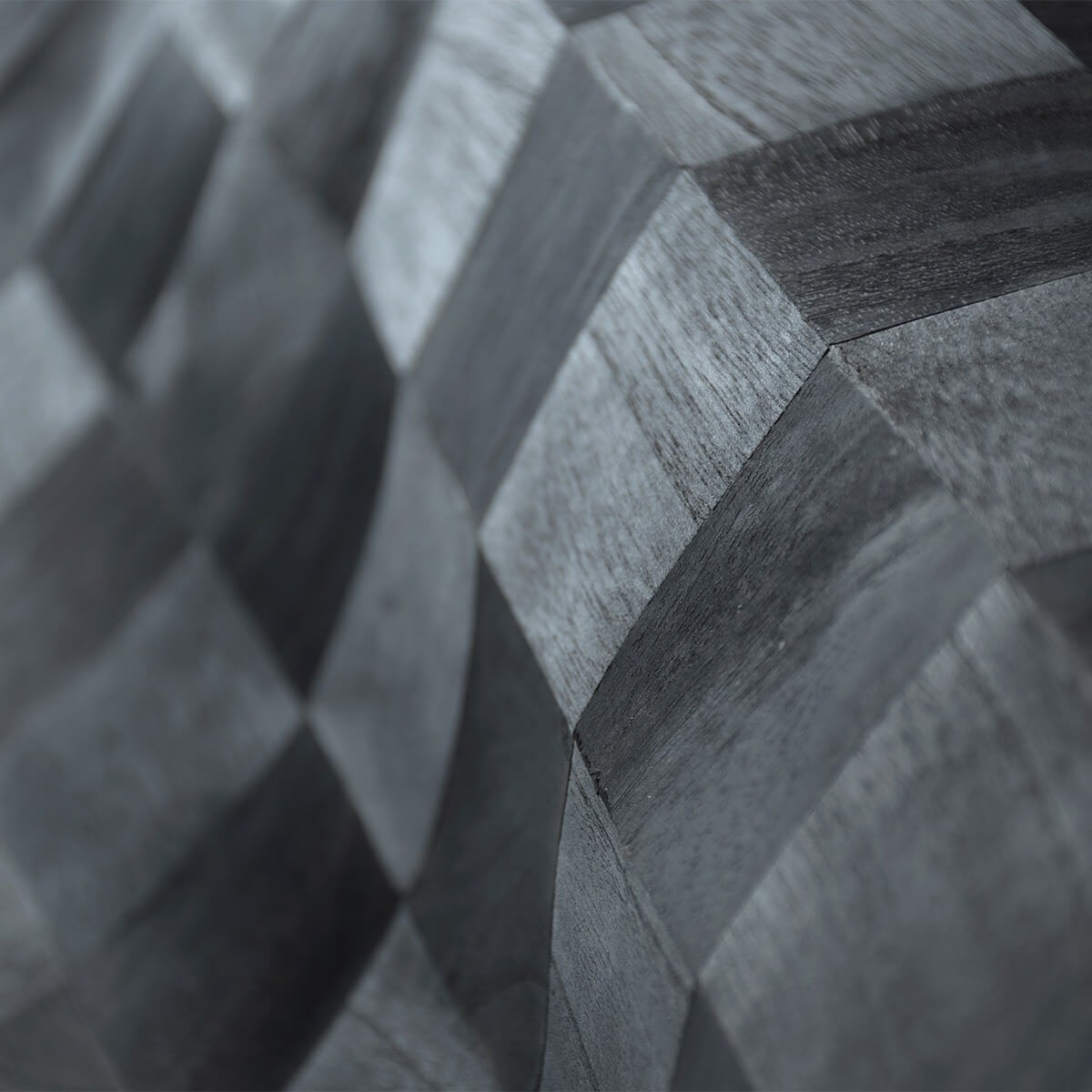 Un insieme di quadrati si allinea con perfetta regolarità sulla carta da parati Grain d'Arte. Ogni pezzo è scolpito nel legno di paulownia, rivelando venature e nodi unici e vari. Queste forme geometriche assumono colori naturali per esaltare il calore della materia.