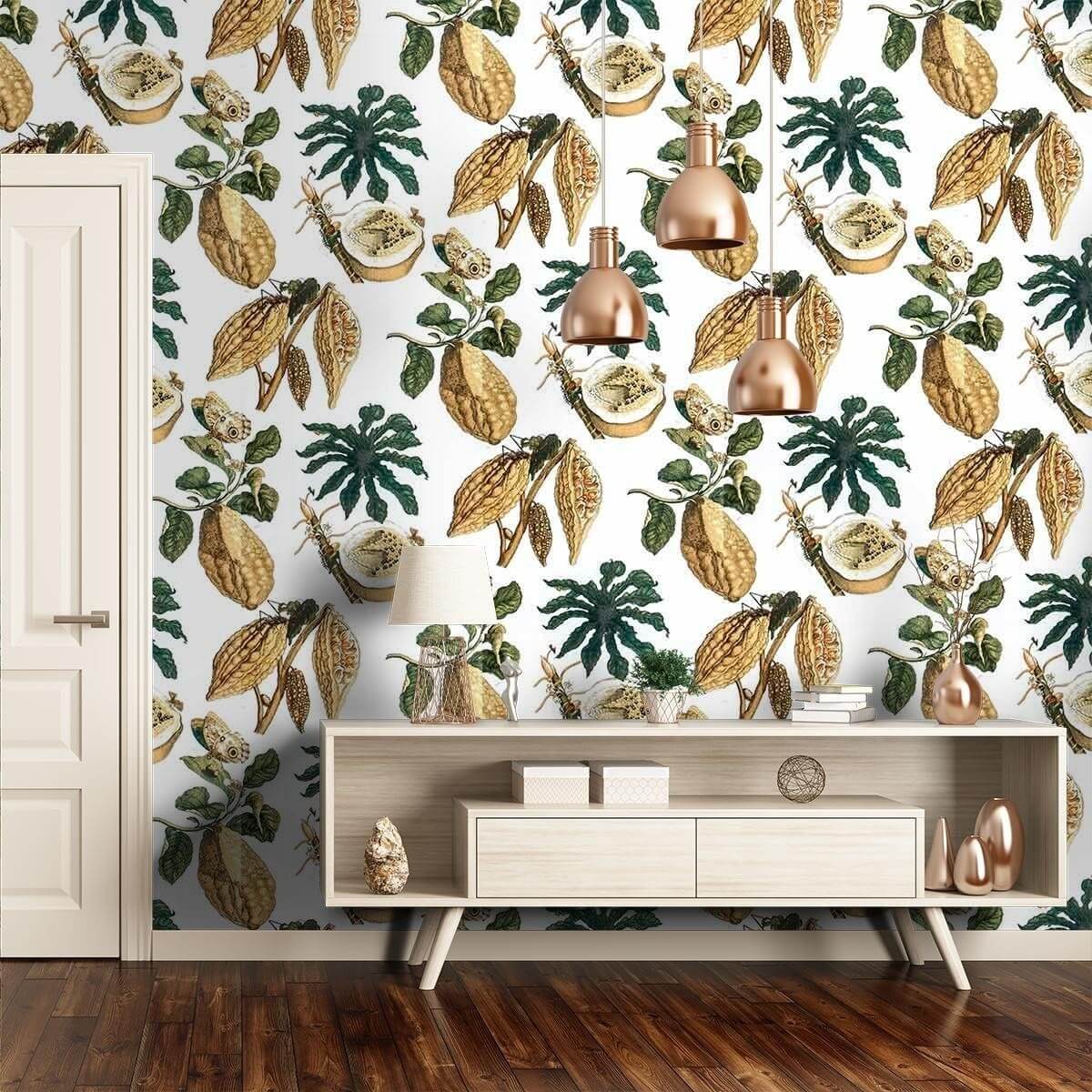 La carta da parati Amazonia di Gaston y Daniela mette in mostra la splendida flora e fauna della foresta amazzonica. La papaia e gli alberi di cacao offrono generosamente i loro frutti. Insetti come bruchi e farfalle tropicali si siedono sulle foglie e sui frutti. Per una maggiore autenticità, il disegno è stampato con cura su un supporto tradizionale.