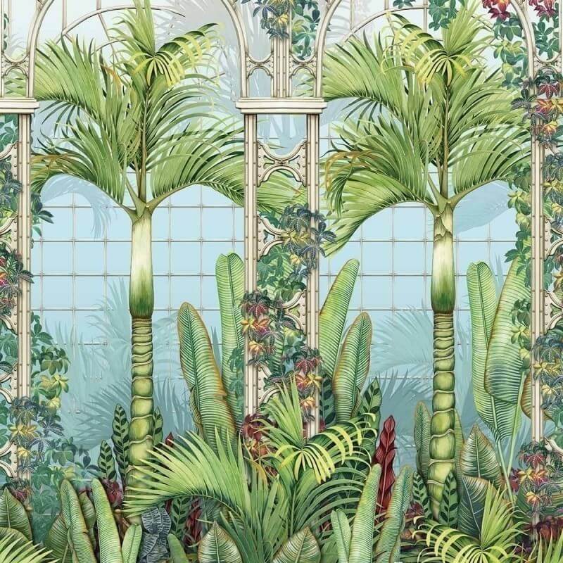 L'insegna della Palm House presenta l'intricata architettura di una serra tropicale che ospita una varietà di piante rigogliose. Osborne & Little enfatizza i dettagli presentando effetti d'ombra sullo sfondo di questo disegno di piante. Questo trompe-l'oeil dai colori vivaci dona un tocco esotico agli spazi abitativi.