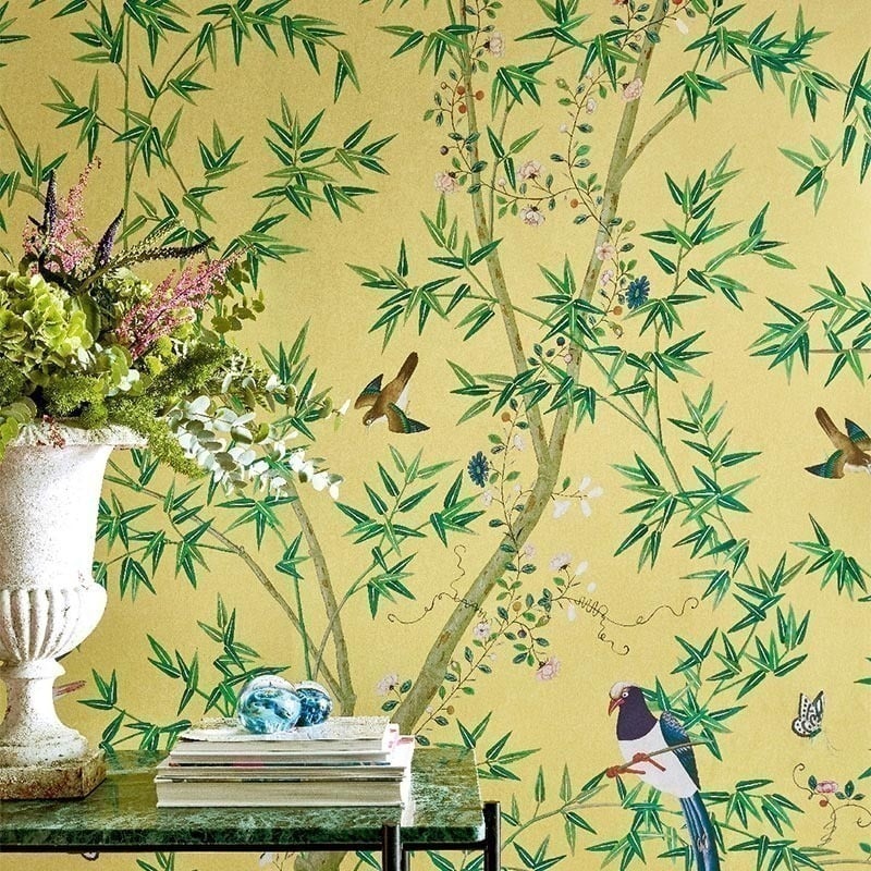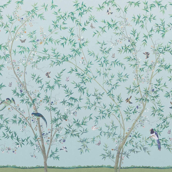 Creato da una versione originale del 1875, questo cartello Little Greene trasuda la vera gioia della natura. Raffigura uccelli e farfalle che volano in una foresta di bambù. Proposto in tonalità rinfrescanti, questo rivestimento dal sapore vintage emana un'atmosfera rilassante.