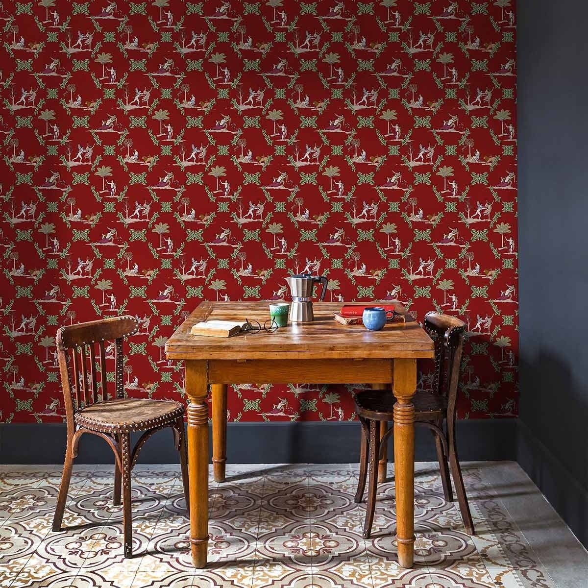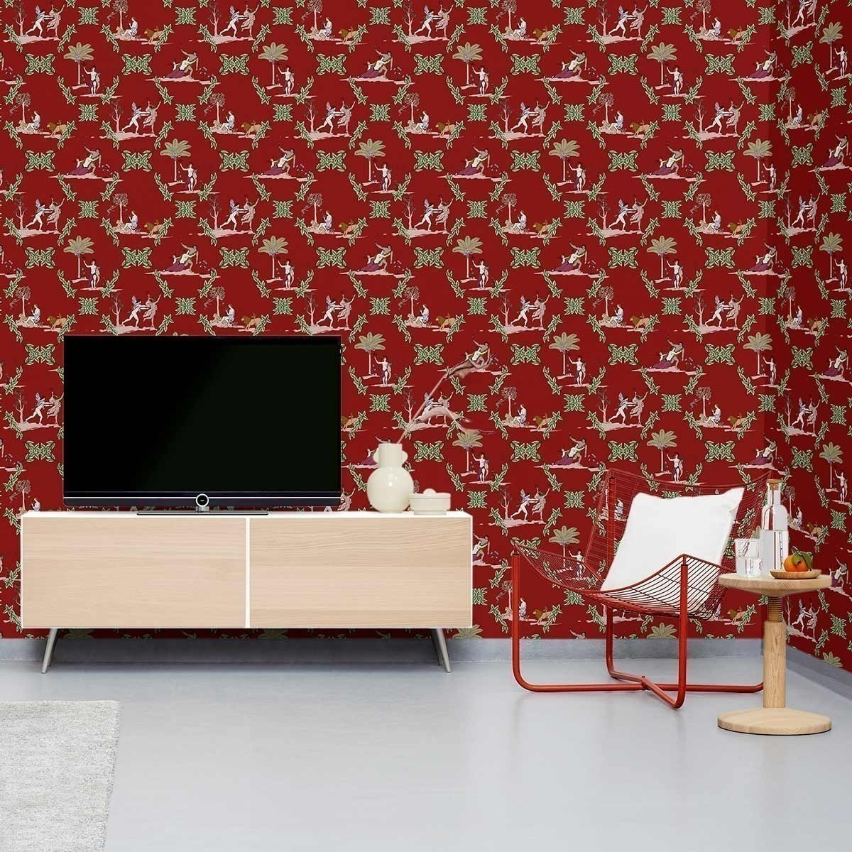 Il rivestimento murale Bucolico presenta un motivo composto da scene varie con persone e animali. Sono incorniciati da un traliccio di foglie che conferisce un tocco romantico all'insieme. Progettato da Coordonné per la collezione Metamorphosis, questo disegno multicolore si presenta su uno sfondo a tinta unita.