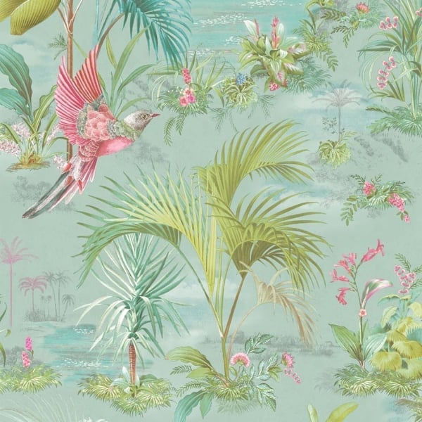 La carta da parati Palm Scene evidenzia un motivo esotico dai colori tenui. Uccelli del paradiso in volo, palme e varietà di fiori formano questo disegno. Il design dona un'atmosfera tropicale alle camere.