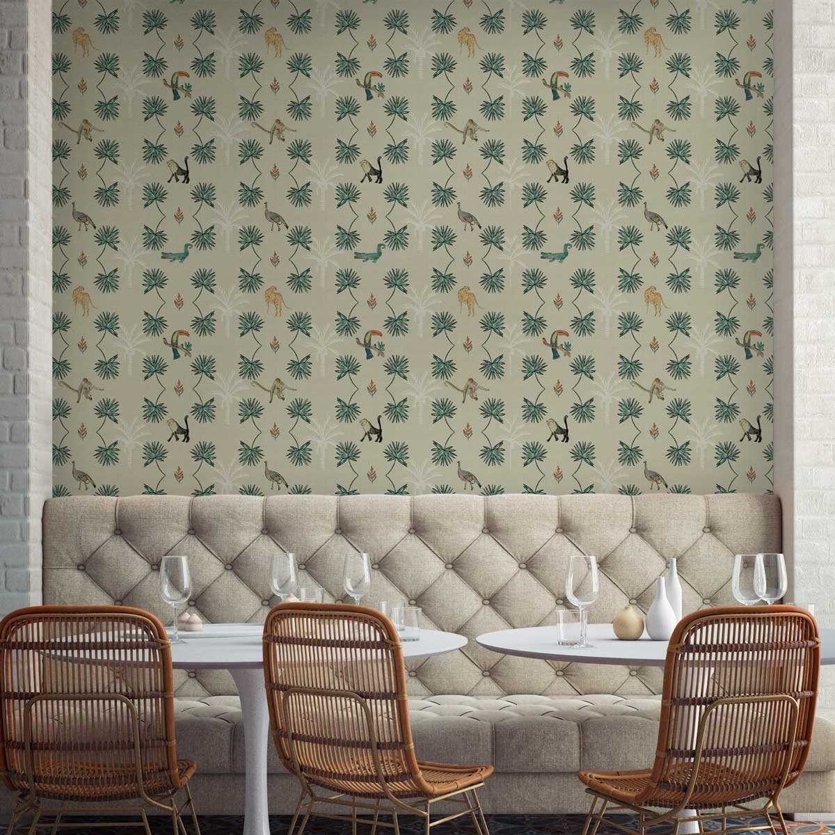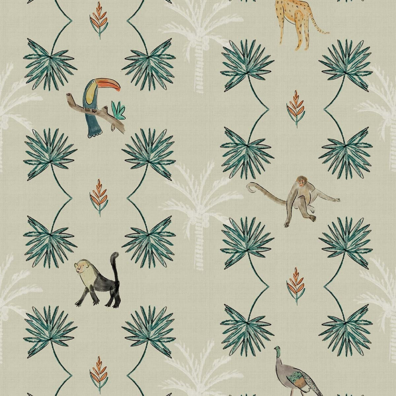 Animali esotici e foglie di palma compongono il motivo della carta da parati Monteverde di Coordonné. Illustrando la fauna e la flora selvatiche del Costa Rica, questo disegno presenta scimmie, tucani e coccodrilli posizionati attorno alle corna. Questi elementi progettati in colori naturali donano uno stile tropicale a qualsiasi spazio abitativo.