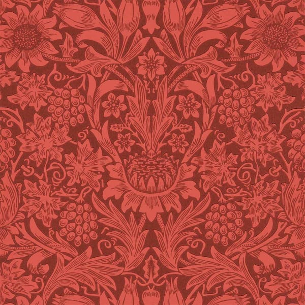 Progettata in un unico colore, grandi girasoli e viti compongono il motivo della carta da parati Sunflower. Queste piante presentano foglie e petali curvilinei dettagliati con striature sottili, che offrono una resa autentica all'illustrazione. Questa romantica decorazione murale fu progettata dal designer britannico William Morris nel 1879.