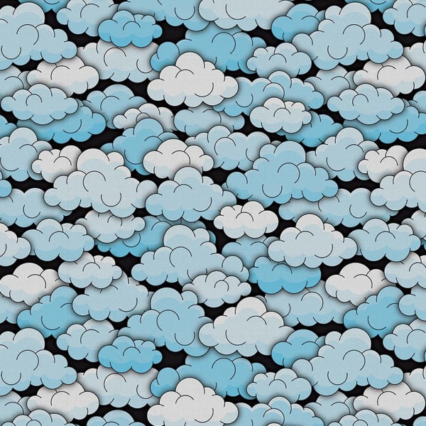 Questa decorazione murale panoramica di Yo2 rappresenta un cielo di piccole nuvole blu che trasportano una stella e vari oggetti incongrui in uno stile contemporaneo senza compromessi.
