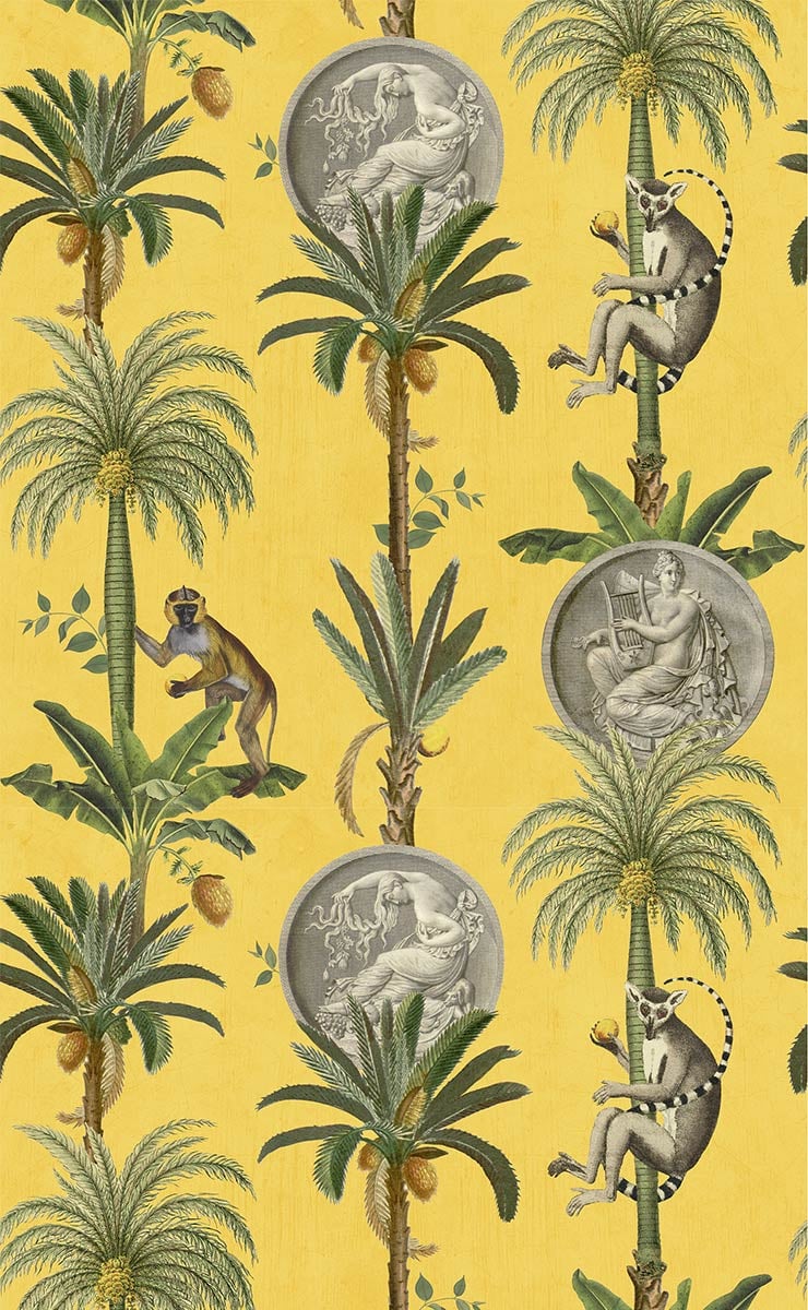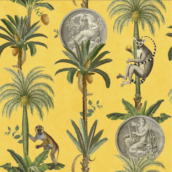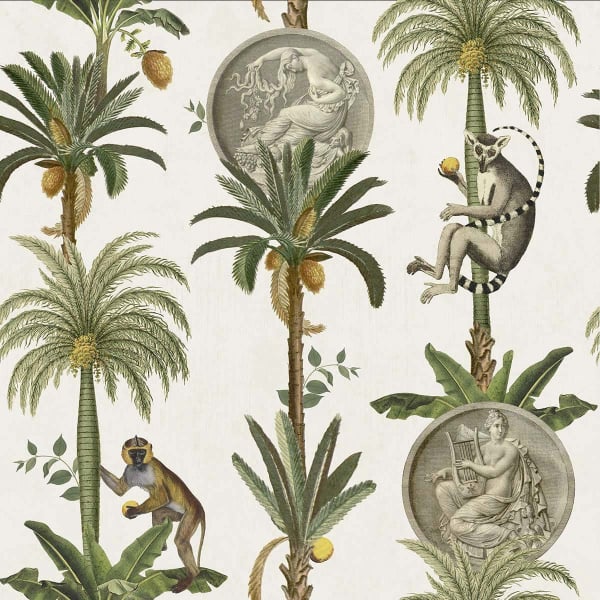 Porta un tocco di esotismo nel tuo spazio abitativo con il design della carta da parati Lemurs di Coordonné. Mette in risalto le palme fruttate che ospitano lemuri e scimmie. Alcuni pezzi decorati con incisioni e figure in toga completano questo motivo. Il tutto adotta una tavolozza di colori naturali che contrastano con uno sfondo semplice.