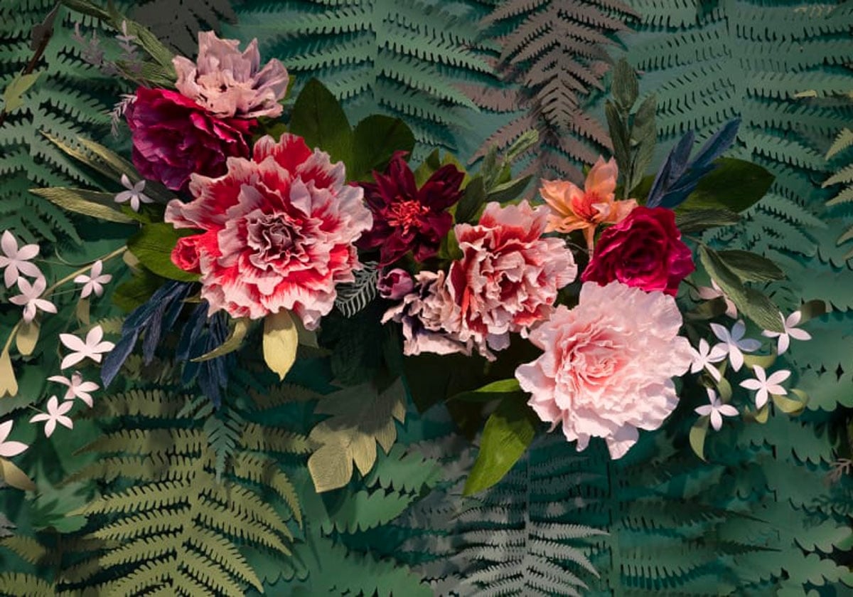 Fotografata in primo piano e originariamente disegnata da carta ritagliata, la composizione floreale del motivo Unfading Flowers presenta fiori generosi che sbocciano su uno sfondo di felci. Vestita di colori vivaci e intrisa di realismo, questa composizione immortale crea un effetto spettacolare per un arredamento unico. Questo pannello è il risultato di una collaborazione tra l'artista Jessica Pezalla e il suo collettivo artistico Bramble Workshop con il Museum of American Art Crystal Bridges a Bentonville, Arkansas.