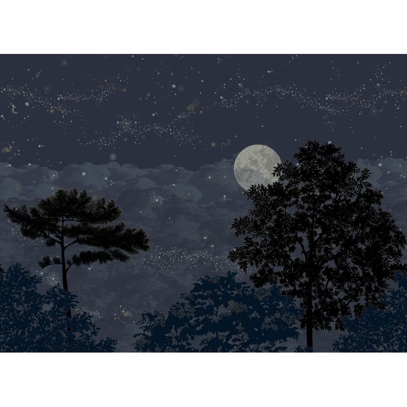 Da un'incisione creata dagli artisti Isabelle Parmentier e Martine Dubreucq, il motivo della panoramica Eclipse presenta un'immagine scura con un paesaggio forestale nel cuore della notte profonda, leggermente illuminato dalla luna e da una nuvola di stelle. Invitando alla contemplazione e al riposo, come una notte sotto le stelle, questo arredamento crea un clima calmo e accattivante.