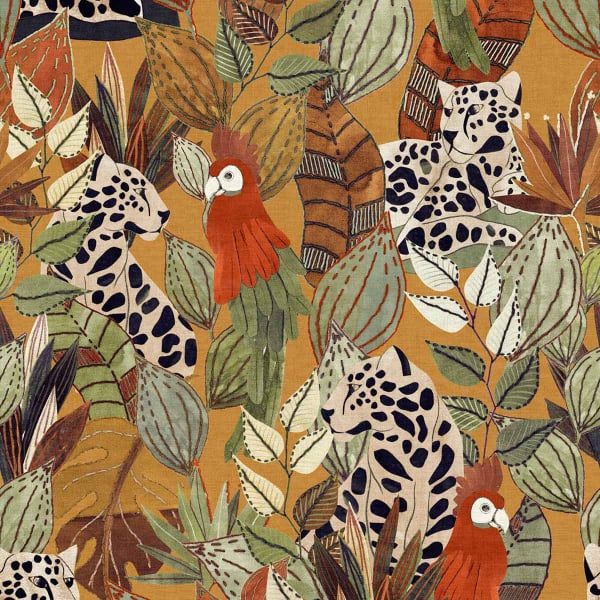 Ricco di colori vivaci, il motivo colorato della carta da parati Giungla mostra leopardi e parrocchetti circondati da vegetazione policroma. La scelta di tonalità profonde conferisce uno stile esotico all'insieme. Questa decorazione murale proposta da JV Italian Living crea una calda atmosfera negli spazi abitativi.