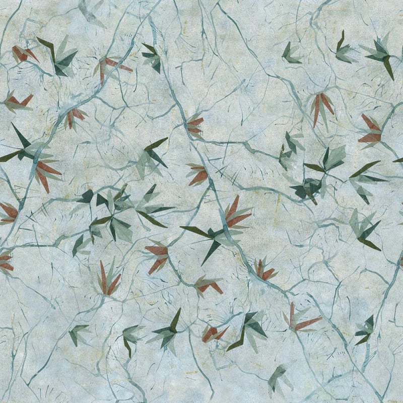 Il rivestimento Augusta di Wall&Decò è caratterizzato da un disegno floreale presentato in tonalità tenui e vivaci. Questo motivo immaginato dall'artista italiana Antonella Guidi mette in risalto le radici decorate con foglie multicolori, evocando l'aspetto di una pianta strisciante su un muro. Resistente all'ingiallimento e all'umidità, questo modello realizzato in fibra di vetro è anche ignifugo.