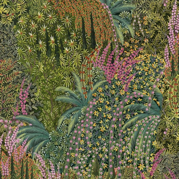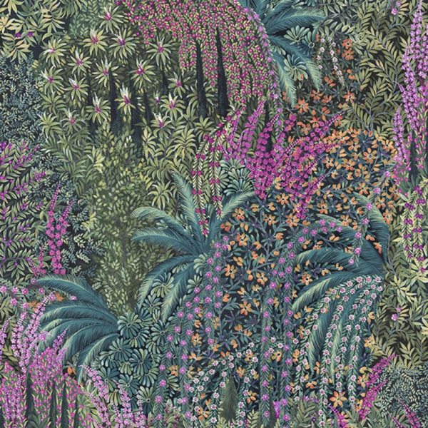 Questa carta da parati Cole & Son presenta colori scintillanti e vivaci. Cascade presenta una stampa all-over dove sbocciano magnifici fiori. Calendule, magenta e foglie di palma si mescolano in un'accattivante scena di vita. Una carta da parati ideale, ad esempio, per ravvivare un soggiorno.
