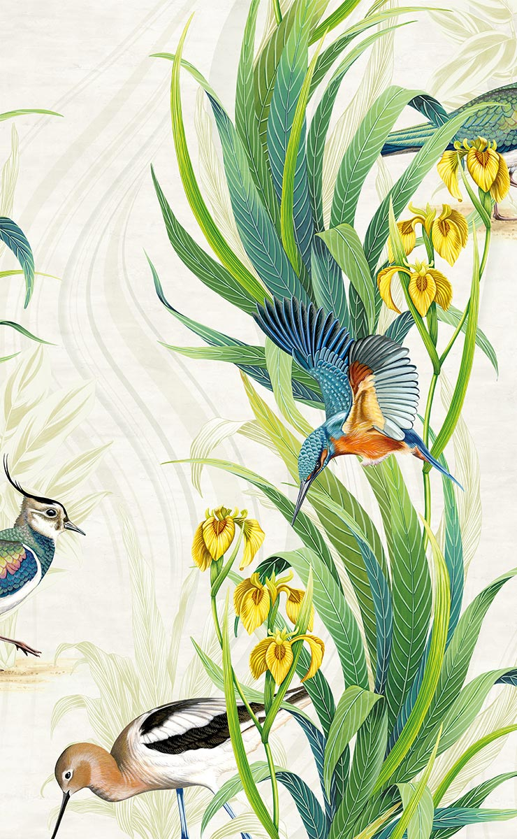 La carta da parati Halcyon decora le pareti con martin pescatori, pavoncelle e avocette appollaiati su iris acquatici. Attraverso questo motivo, Osborne & Little allude al mitico Alcione, uccello acquatico considerato segno di buon auspicio. Il disegno si ripete per dare un disegno verticale che enfatizza l'altezza delle pareti.