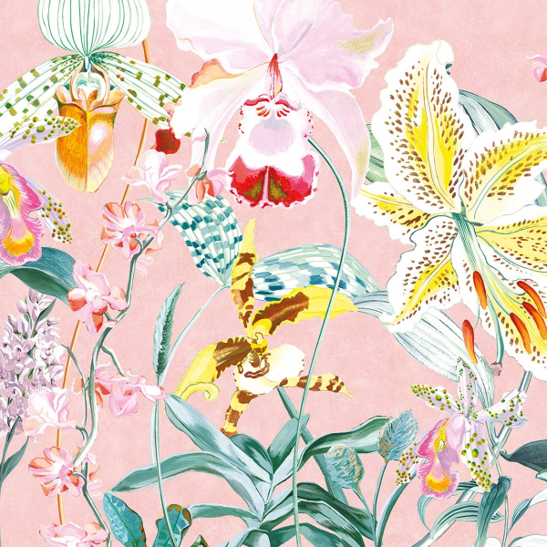 La carta da parati Orchid Panorama Macro di Texturae è una versione di grande formato di un altro modello con lo stesso nome. Il motivo, opera della pittrice Sara Ricciardi, immerge gli interni in un paesaggio esotico di orchidee e gigli brillanti. L'artista raffigura le loro grandi corolle maculate con colori vivaci smorzati da sfumature sbiadite. Realizzato in vinile, è lavabile e non teme l'umidità.