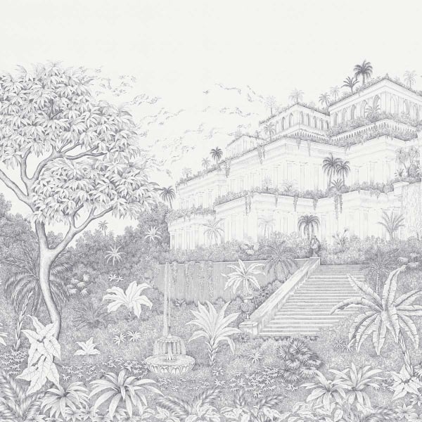 Les Dominotiers fa rivivere un ricordo del Vecchio Mondo con la carta da parati panoramica Jardin Suspendu. Il modello raffigura i leggendari Giardini di Babilonia, dove la flora esotica prospera su terrazze rialzate. Le figure, disegnate con inchiostro nero, hanno un aspetto invecchiato. Sembrano incisi sulla parete da secoli, e infondono agli interni il loro fascino antico.