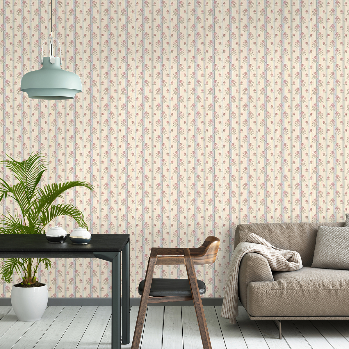 Mademoiselle, una carta da parati di Quenin, riproduce l'aspetto tessile dei lampasso di seta in stile Luigi XVI. Presenta sottili strisce scanalate in colori tenui, punteggiate da un bouquet di fiordalisi. I fiori conferiscono alle figure un sottile carattere femminile, mentre la freschezza dei colori crea un'atmosfera leggera e rilassante.
