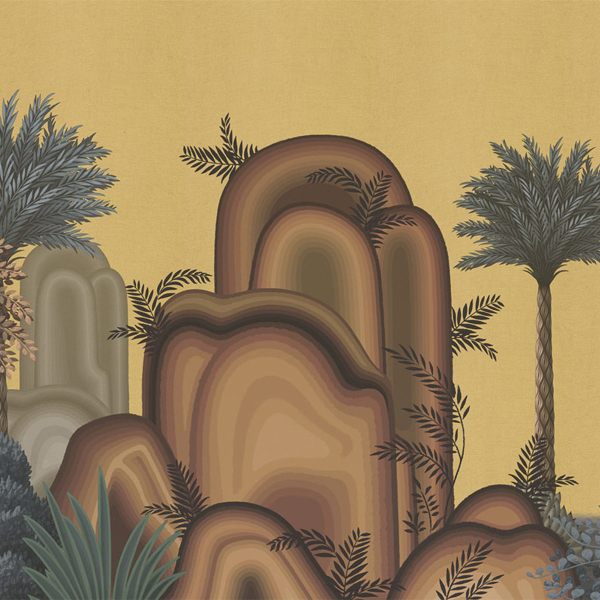 The Landscape offre un'immersione totale in un paesaggio esotico, come un murale che cattura lo sguardo. Firmato London Art, questo panorama presenta un susseguirsi di palme, arbusti e cespugli intrecciati con le montagne. Realizzata con colori profondi e neutri, che evocano alternativamente l'alba e il tramonto, questa carta da parati dona un'atmosfera rilassante agli spazi.
