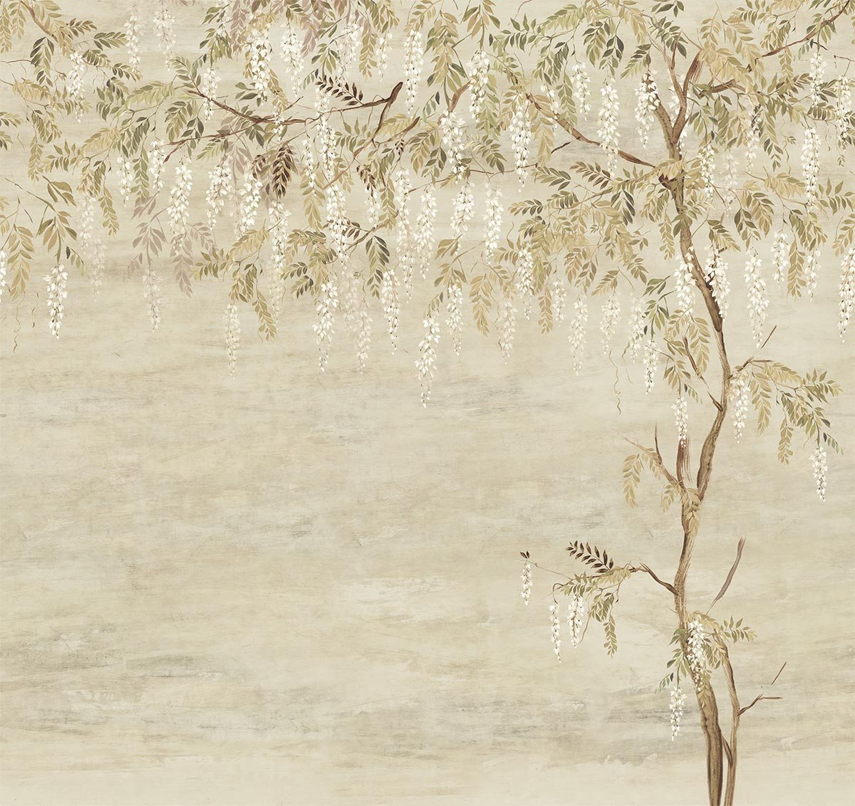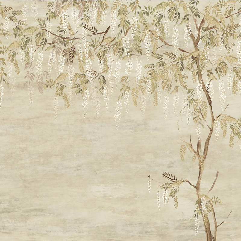 Decorato con un patio, l'interno si trasforma in un rifugio dove la tranquillità è la parola d'ordine. Presenta un albero con le sembianze di un maestoso glicine, che dispiega le sue foglie e i suoi fiori delicati verso il firmamento. Creata da Masureel, questa carta da parati panoramica è un invito al relax e alla contemplazione.