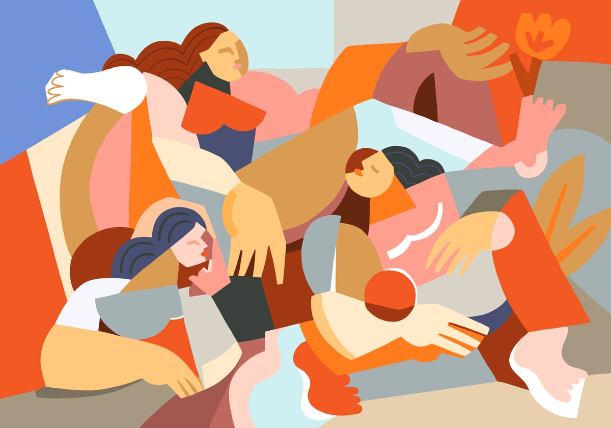 Il motivo della carta da parati panoramica Summer Evening rivela una composizione grafica colorata costruita con forme geometriche, come ritagli di carta. Immaginato dall'artista Claire Prouvost, questo modello presenta silhouette femminili suggerite da volti, mani e capelli. Insieme, donano serenità all'arredamento.