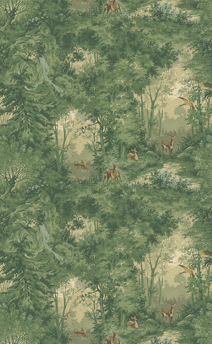 La carta da parati Grand Mulberry Woodlands cattura la bellezza di una radura nel cuore di una foresta selvaggia. I cervi si radunano intorno a un ruscello, dove si uniscono a loro le anatre selvatiche. La scena evoca le Highlands scozzesi, alludendo al mitico massiccio forestale caledoniano ormai scomparso. Apre le pareti verso le profondità del bosco, portando un tocco di natura e serenità in qualsiasi spazio.