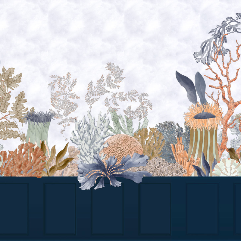 Disegnata a mano, la carta da parati panoramica Nautilus immerge gli spazi in un'incantevole flora marina. La parete diventa un gigantesco acquario, dove anemoni, coralli, alghe e altre creature espongono le loro forme e colori sorprendenti. Raccordo Parfait completa l'insieme con un basamento haussmaniano, un tocco architettonico che amplifica allo stesso tempo l'effetto tridimensionale.
