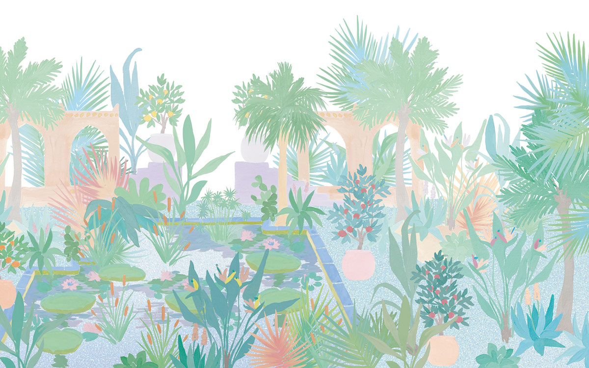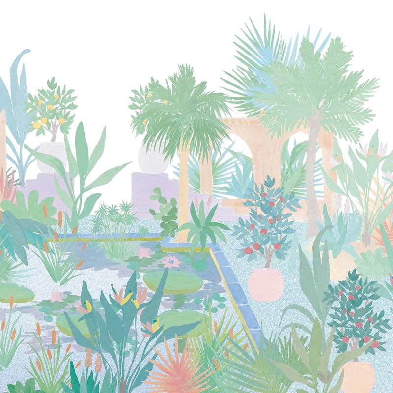 La carta da parati panoramica Riad cattura l'anima di un patio dimenticato, dove la natura riprende i suoi diritti. Palme, fiori ed erbe selvatiche spuntano tra i resti di un giardino marocchino. Uno stagno ancora scintillante, invaso da ninfee e canneti, diffonde la sua freschezza dalla parete. Tutta questa scena poetica, immaginata da Raccord Parfait, impregna ogni giorno di vitalità e di rinnovamento.