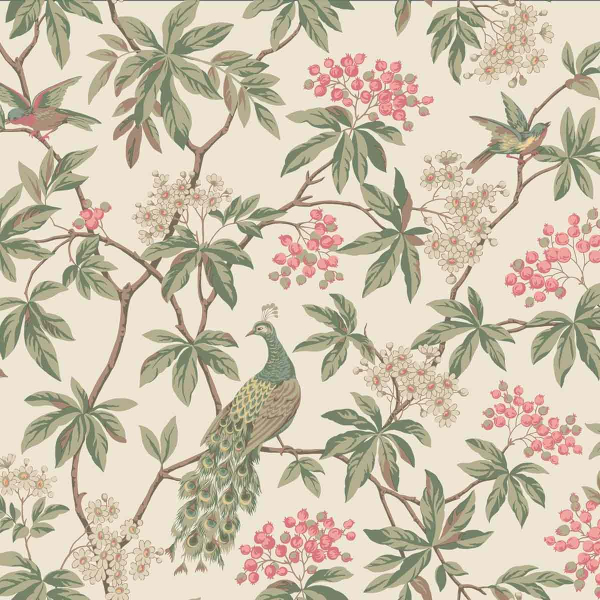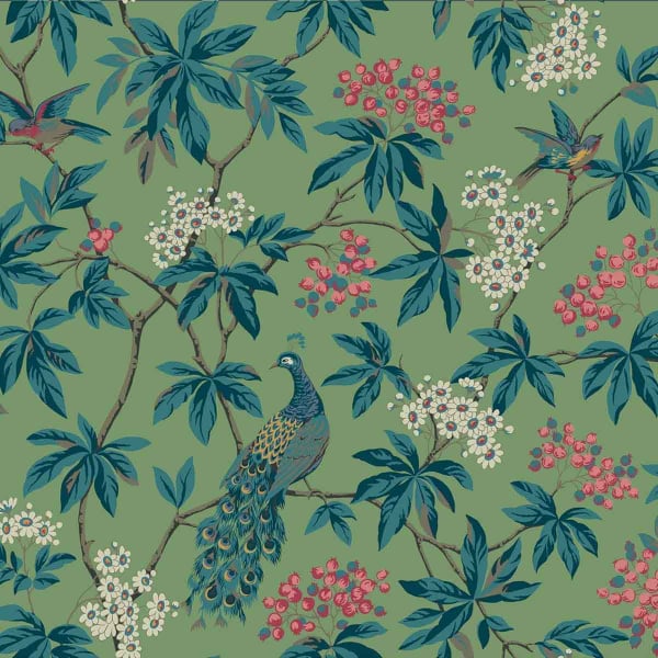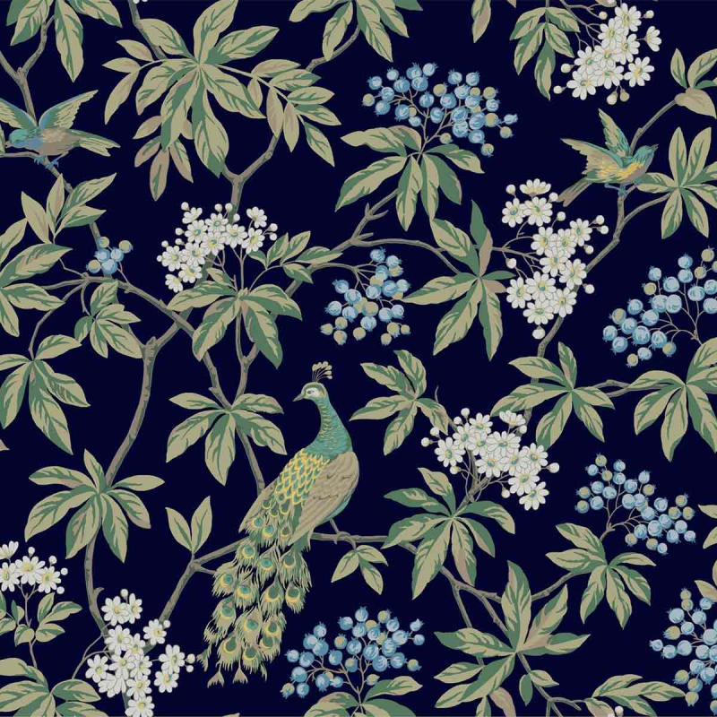 Un motivo botanico si svela sulla superficie della carta da parati Peacock Estate prodotta da York Wallcoverings. Un pavone con la coda spiegata emerge al centro di un fogliame lussureggiante, ornato da grappoli di bacche e fiori sbocciati. Due passeri con le ali spiegate animano questa composizione. Queste illustrazioni evocano la tranquillità di un giardino sospeso nel tempo.