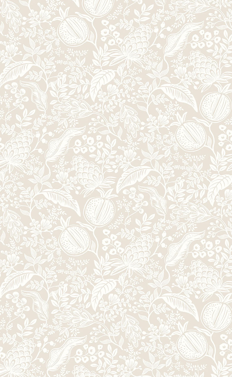 Melograni e fiori si intrecciano con eleganza sulla carta da parati Pomegranate. Un fogliame esotico avvolge queste forme in una composizione abbondante e controllata. Grazie alla finezza del tratto, il motivo vegetale evoca i dettagli delle antiche incisioni. L'insieme presenta un arredo vivace, ricco di elementi organici, creato da Rifle Paper Co.