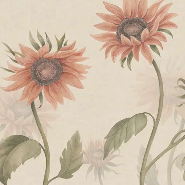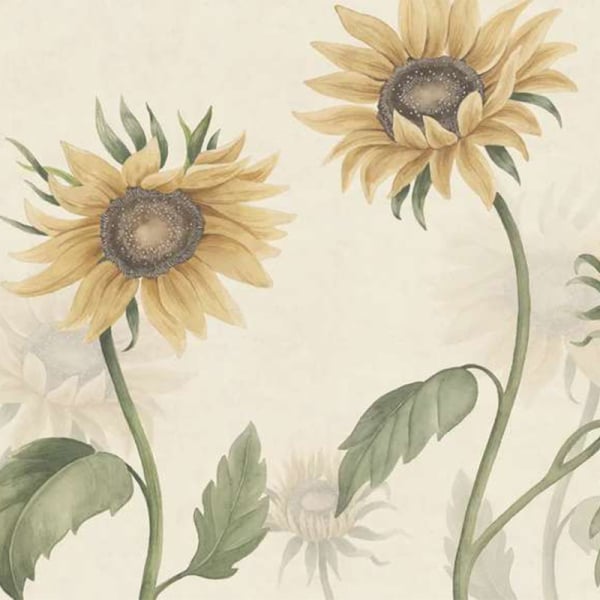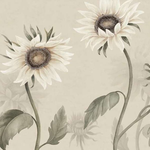 Sunflowers, una carta da parati panoramica firmata Sandberg, mette in risalto grandi girasoli dipinti a mano. I fiori sono disponibili in morbide tonalità di giallo, marrone e verde, su uno sfondo caldo color miele. La struttura del disegno si basa su steli ricurvi, foglie nervate e grandi corolle che attirano l'attenzione. Ombre leggere attraversano dolcemente la scena per evocare la presenza discreta del vento e della luce.