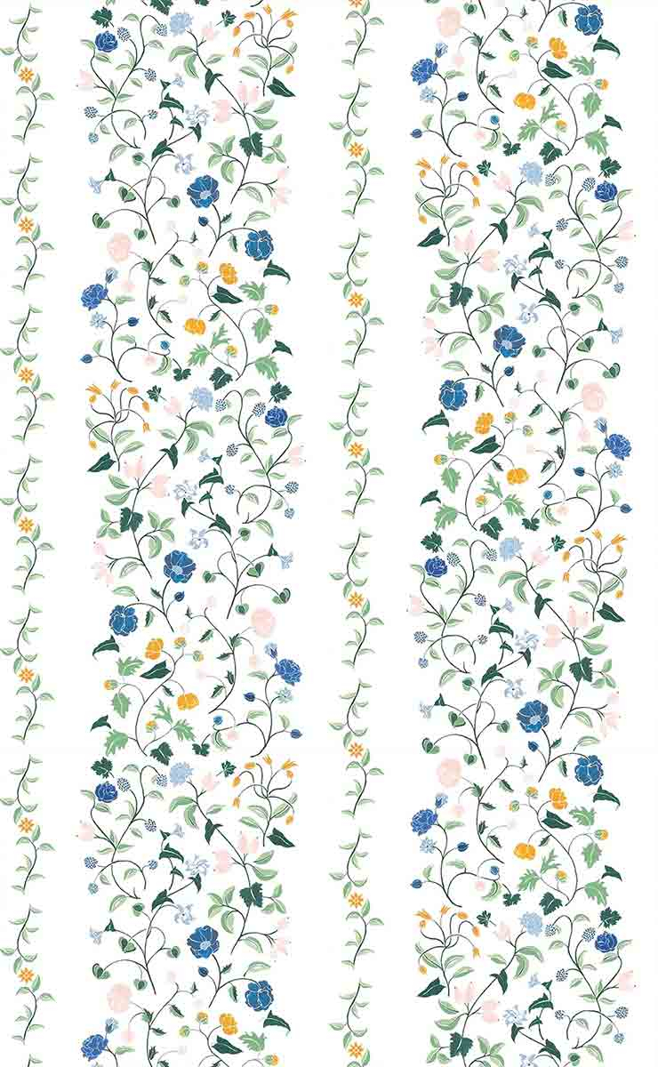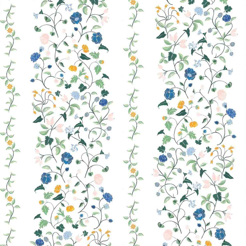 Sweet Blossom Rayure è una carta da parati firmata Isidore Leroy. Il suo motivo floreale è composto da delicate ghirlande disposte in strisce verticali. Gli steli si dispiegano con finezza, punteggiati da piccole corolle e foglie leggere. Ogni elemento è disegnato con cura visibile nei contorni. La disposizione regolare conferisce all'arredamento una struttura equilibrata.