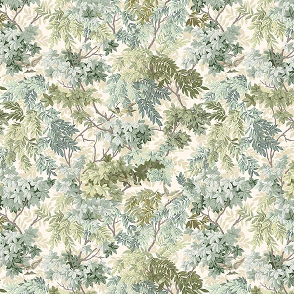 La carta da parati panoramica "Birds" di Isidore Leroy raffigura una vegetazione lussureggiante in cui ampie foglie si intrecciano. I rami si intrecciano, creando un'impressione di profondità. Piccoli uccelli compaiono tra i rami, congelati nell'atto di spiccare il volo o di battere le ali. Il design cattura fedelmente la ricchezza delle forme e delle texture.