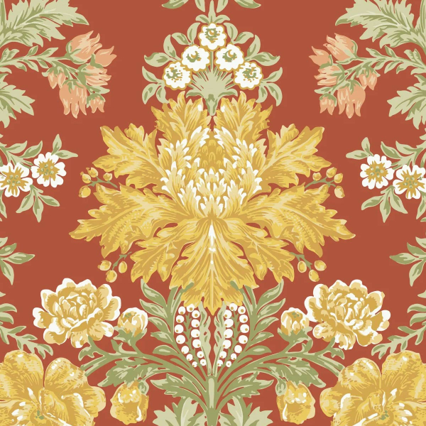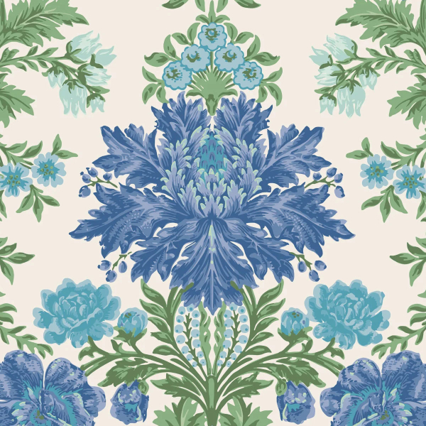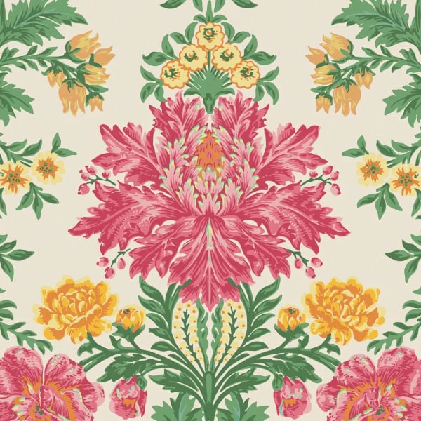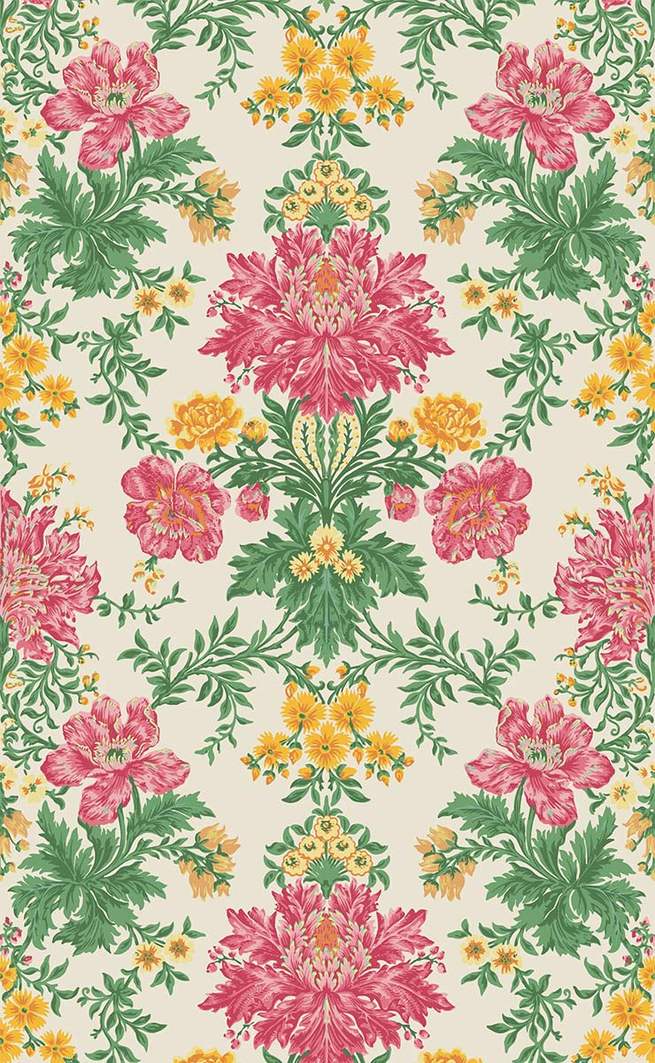 La carta da parati Poppies presenta un motivo floreale stilizzato con accenti classici, composto da maestosi bouquet simmetrici. Le piante, finemente ordinate, formano un damasco reale trasposto in un universo vegetale. L'illustrazione segue un ritmo strutturato, punteggiato da foglie delicate e fioriture lussureggianti. Questa creazione riflette l'eredità grafica di Cole and Son.